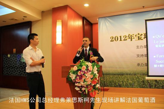 作为法国驻武汉总领事馆的代表,法国HWS公司总经理、品酒师弗莱思斯柯先生为大家现场讲解了法国葡萄酒相关知识和文化,并带领大家品鉴了两款法国原瓶进口葡萄酒。宝玛隆公司经理讲解了此次新品推介会推出的一系列买赠优惠、返利优惠、附赠品优惠等订货支持政策。