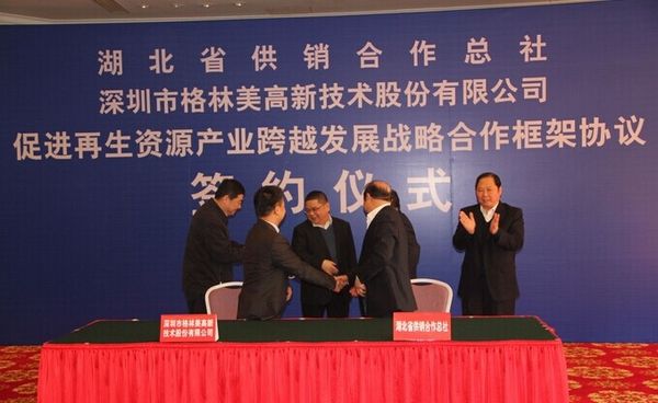 2015年2月12日上午,湖北省供销合作总社(以下简称省供销社)与深圳市格林美高新技术股份有限公司(以下简称深圳格林美公司)在武昌东湖宾馆洞庭湖厅举行战略合作签约仪式。省供销社党组成员、副主任明平安与深圳格林美公司副总经理周继锋代表双方签署协议。省政府副省长甘荣坤、副秘书长聂昌斌,省供销社党组书记、主任赵东风,深圳格林美公司董事长许开华等领导共同见证双方签约。签约仪式由聂昌斌副秘书长主持。