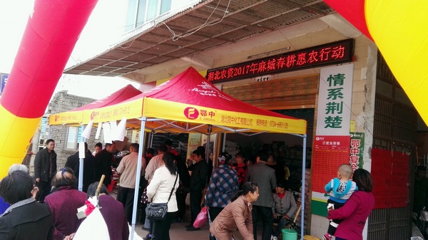3月27—28日,湖北农资2017年春耕惠农行动暨农业科技服务下基层活动(麻城站)在麻城市顺河镇顺利举行。此次活动由湖北楚丰农资连锁有限公司和湖北鄂中化工有限公司联合承办,也是鄂东市场厂商联合下乡惠农的首场活动。活动以“鄂中”、“德福隆”等系列产品推广为主题,从春耕备耕过程中的用肥常识、产品属性、使用方法等方面为广大农民朋友进行了详细宣传和讲解,真正把农业科技知识服务送到乡镇基层和农村的田间地头,活动覆盖了麻城顺河镇等周边12个乡村,受众群体达200余户。