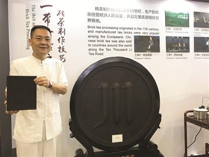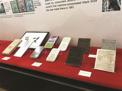 展台上,湖北省赵李桥茶厂不同时期的4块砖茶及模板一字排开,引人注目,这些砖茶的生产年份从1910年到1981年不等,见证了赵李桥茶厂的砖茶生产和贸易历史。