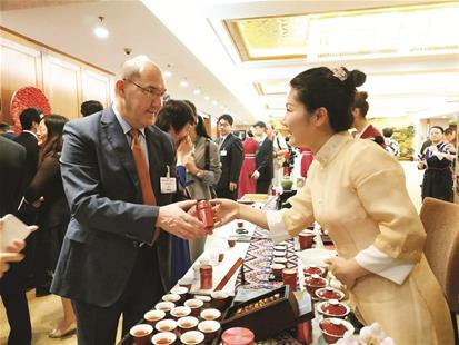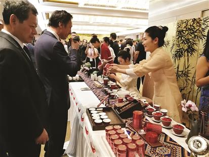 茶艺师娴熟优雅的为嘉宾展示茶艺,纤手翻飞,似翩然起舞,给热闹的会场带来缕缕茶香,令人静心。各国来宾饶有兴趣的欣赏茶艺表演,用手机拍照或摄影记录,品尝了宜红茶以后,更是无不称好。