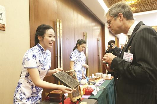 而展台旁的茶艺表演区更是挤满了嘉宾。用悬壶冲淋法冲泡的米砖茶,口味醇正厚重,很受外宾青睐,来自俄罗斯、日本、法国、英国、巴基斯坦、比利时等各国嘉宾品尝完后都纷纷赞扬。摆在一旁的300多份送给嘉宾的小砖茶很快就被领取一空。