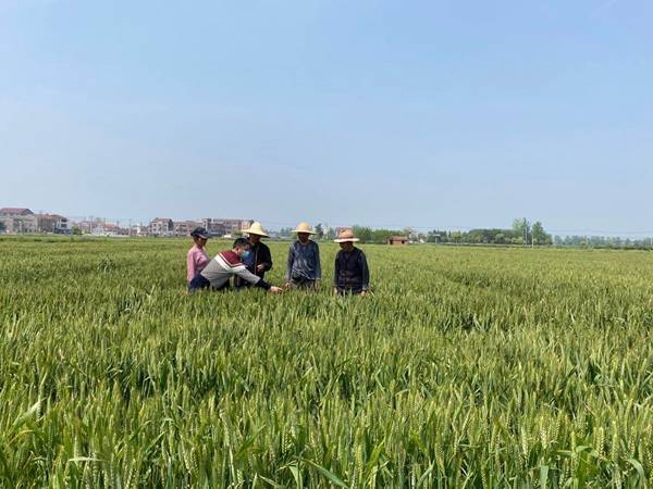 4月18日,楚丰连锁公司周锋在江陵县资市镇李塘村湖北农资复合肥试验示范田查看地里的小麦长势,交流病虫害防治经验。