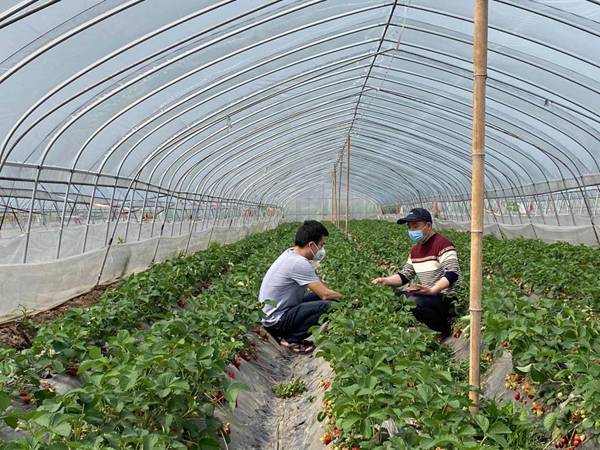 春耕以来,类似这样的农化服务案例不胜枚举。4月18日,楚丰连锁荆州分公司业务员周锋应邀来到了岑河镇郎群草莓园现场走访查看。该园部分大棚内草莓覆盖了白霜,根据多年积累的经验,周锋判断,这一问题是由白粉病导致。“白粉病属于真菌病害,病菌随病株、病叶等残存于土壤中越冬,病菌孢子主要靠空气传播。当棚内温度达到15-20摄氏度,湿度达到90%以上或异常干燥时最容易发病,通常发病期在坐果期和采收后期。”周锋对种植户郎群认真分析了病情,并推荐了后期预防治疗的方法。