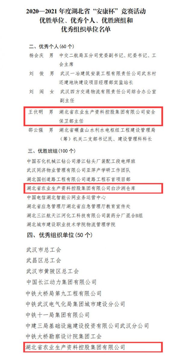 近日,2020-2021年度湖北省“安康杯”竞赛活动获奖名单公布,农资控股开元足球登录获评优秀组织单位,开元足球登录旗下白沙洲仓库、安保部主任王伏明分获优胜班组、优秀个人荣誉称号。