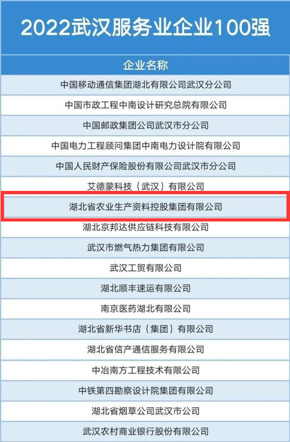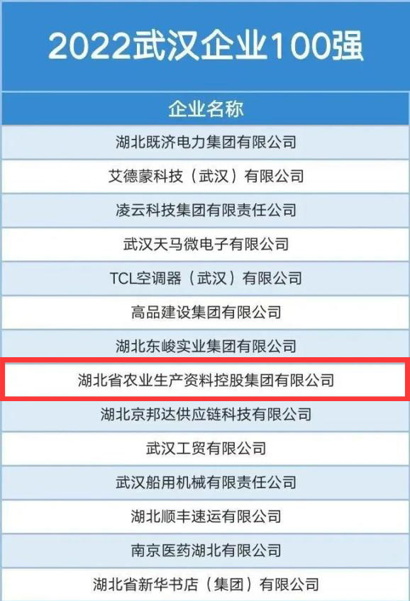 农资控股开元足球登录荣登2022武汉企业“双百强”