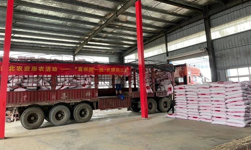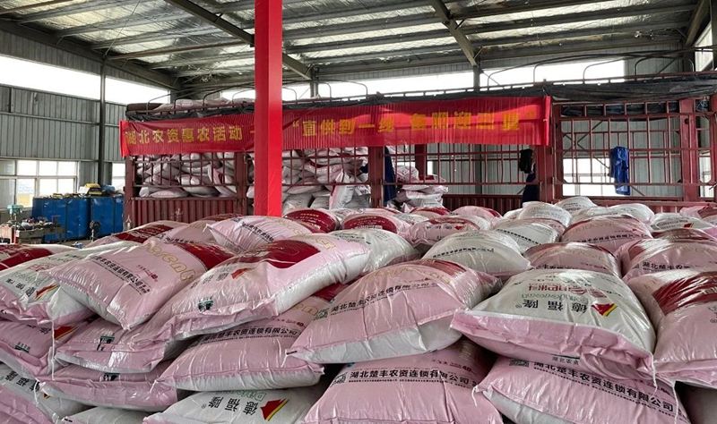 5月30日,在武汉市东西湖区辛安渡镇的郭家台农产品销售专业合作社仓库内,一辆由潜江富来地工厂直发的40吨水稻专用肥,正被工人们井然有序地码放入库。