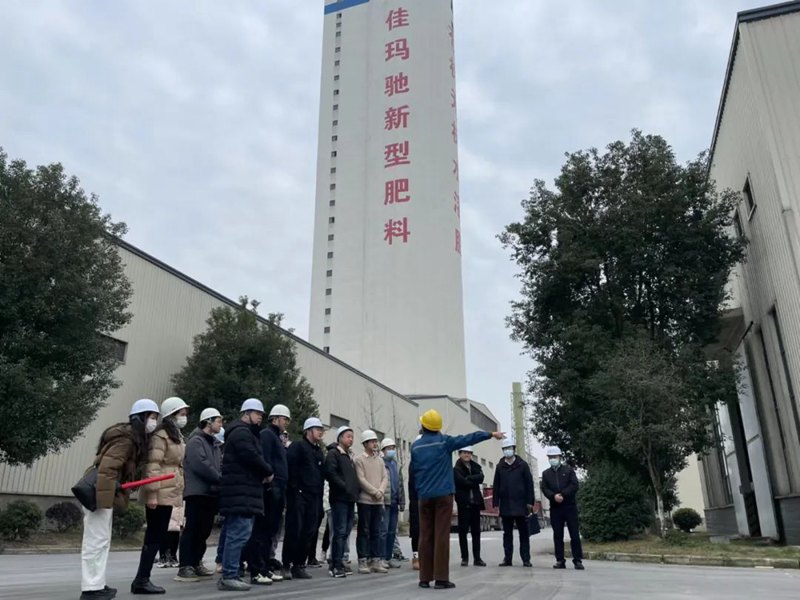 在湖北佳玛驰生态农业有限公司工厂内,新员工们实地参观了高塔、转鼓生产线,近距离感受现代化生产装置和设备,工厂行政总监朱华荣详细介绍枝江佳玛驰的发展历程、生产工艺、绿色产品,并从技术研发、土壤调理、产品功效等方面,对黄腐酸有机水溶肥等新型肥料进行重点宣讲。在佳玛驰公司农资原料储备库内,新员工现场参观了公司代理的部分原材料吨袋产品,进一步熟悉化肥基础知识,了解掌握原料产地分布情况。