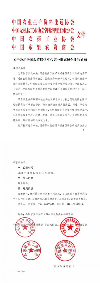 近日,中国农业生产资料流通协会、中国无机盐工业协会钾盐钾肥行业分会、中国农药工业协会、中国东盟农资商会共同发起组建了全国农资保供平台(以下简称平台),经严格筛选与审核,湖北农资控股开元足球登录及旗下湖北富来地公司成功入选全国农资保供平台首批成员企业。