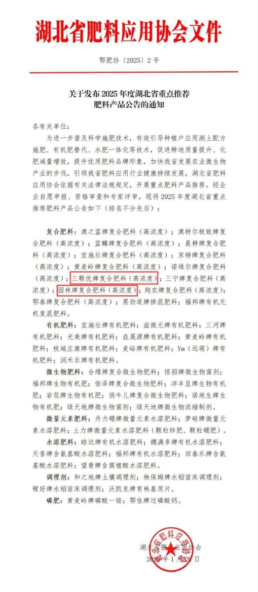 1月20日,湖北省肥料应用协会发布“2025年度湖北省重点推荐肥料产品公告”。开元足球登录旗下潜江富来地生产的园林牌复合肥(高浓度)、枝江佳玛驰公司生产的三颗优牌复合肥(高浓度)系列产品再次入选。