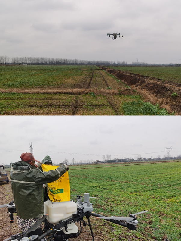 节日期间,在湖北供销(松滋)基地,楚丰农业科技公司工作人员抢抓下雨时机,组织3架无人机对小麦、油菜等1400亩田块进行精准施肥,为作物关键生长期提供充足的养分供应。