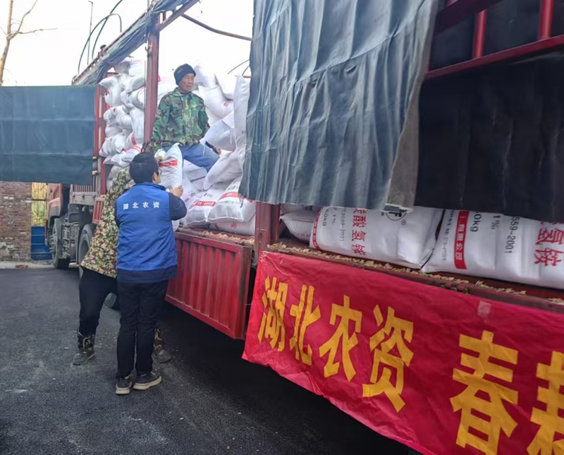 正月初六,在嘉鱼县新街镇农资网点,楚丰连锁公司业务员协助客户卸载35吨碳铵。节日期间,该公司做好基层网点的化肥储备和调运,共计销售各类化肥2400余吨。