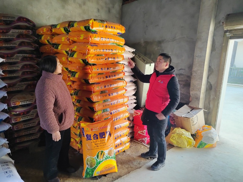 正月初六,在荆州市沙市区岑河镇农资基层门店,楚丰为农公司业务员现场查看货物库存,目前,该网点库存各类肥料14吨,可及时提供给周边农户。