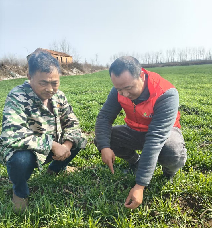 正月初七,在荆州市荆州区菱角湖农场双闸分场三队,楚丰为农公司农技人员回访农户,提醒利用近期降雨,为分蘖和拔节期小麦追施尿素或高氮复合肥,并结合喷施农药预防2月倒春寒及麦圆蜘蛛、麦蚜危害。